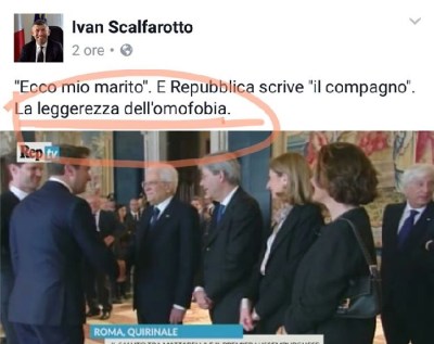 Il motivo? Ha osato – pensate voi quale crudeltà, quale inenarrabile perfidia, proprio roba da matti – definire «compagno» anziché marito colui che nel maggio 2015 è convolato a nozze con Xavier Bettel, il premier lussemburghese, ieri appunto intento, in occasione della cerimonia per il sessantesimo dei Trattati di Roma, a presentare il suo sposo ad un immaginiamo estasiato Sergio Mattarella. Sì, lo so, avete ragione, di fronte a notizie simili viene da farsi una risata, e pure bella grande.