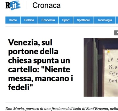 Nella vicenda di don Mario S., il sacerdote che presso la chiesa di Sant’Erasmo, nella piccolissima isola delle Vignole, nella Laguna veneziana, ha sospeso la Messa «per mancanza di fedeli», c’è sicuramente tutto il dramma di un Cristianesimo in ritirata, ma non ridurrei il problema ad una questione di numeri. Mi spiego. E’ vero che in Italia, oggi, la domenica va in chiesa, in media, meno di una persona su cinque (l’Istat dice una su tre, ma non specifica di quale luogo di culto si tratti e, soprattutto, si basa su ciò che la gente dice, non su quello che fa, che di solito è meno), ma il vero guaio è quello che denunciava il cardinal Biffi (1928-2015): «Non bisogna aver paura dei cattolici non praticanti, ma dei praticanti non cattolici».