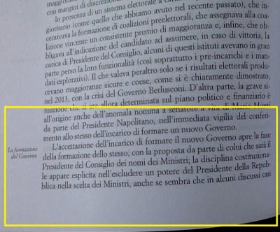 Tuttavia, per andare fino in fondo ho voluto consultare non uno bensì tre differenti manuali di diritto costituzionale di questi anni, e dunque attuali. E devo dire che, purtroppo per il Mattarella fan club, neppure lì ho trovato granché che suffraghi il diritto di veto nei confronti di un ministro. Anzi. Il Caretti-De Siervo lo esclude categoricamente (cfr. Diritto Costituzionale e Pubblico, Giappichelli, 2017, p.243). Sul punto il Barbera-Fusaro è invece più flessibile, ma sottolinea come il fondamento di questo veto sia molto discusso, anche se il premier non potrebbe impuntarsi su un ministro su cui il PdR quel veto pone; ma questa condizione – viene specificato – dipende dalla spinta politica di cui il premier incaricato gode (cfr. Corso di diritto pubblico, Il Mulino, 2016, p.345).
